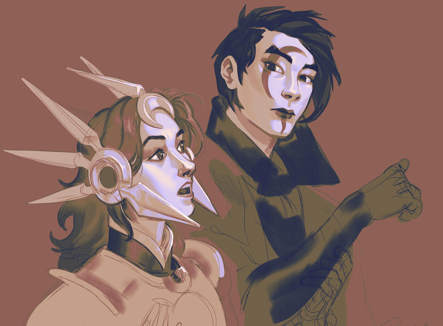 (Semi-pained but not fully polished. Sketch lines are left around, while the main area of interest is rendered. It's faster than illustration. Great for character profiles where you don't need every detail rendered)